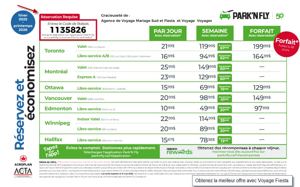 Pour vos besoins de stationnement durant vos vacances dans le sud, pensez à Park N Fly. Il est important de réserver votre place sur le site internet de Park N Fly directement. Sans réservation, il est possible que vous soyez refusé. L’espace de stationnement est restreint. Voici le coupon rabais Park’N’Fly en PDF